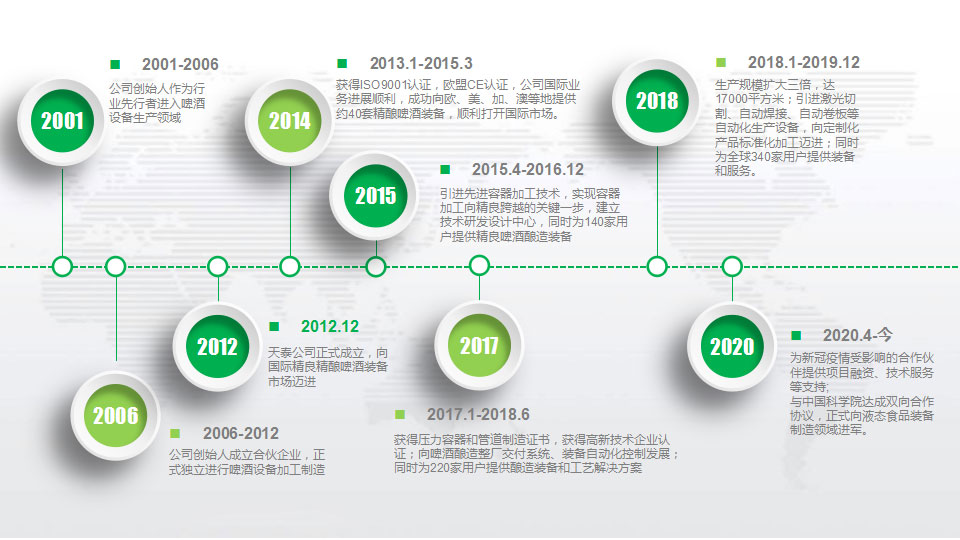 山東天泰啤酒設備有限公司(SHANDONG TIANTAI BEER EQUIPMENT CO.,LTD)是一家專業的精釀啤酒設備生產服務商。公司2012年在山東省濟南市成立。生產工廠坐落于德州臨邑高新科技產業園,占地85畝。公司下設技術研發部、生產部、現場工程部、供應部、質管部、售后服務部、市場部、行政部、財務部、信息管理部以及試驗研發中心等部門。以高級工程師為核心的技術工藝研發專家團隊,以精益生產為準則的生產團隊,為市場提供優質的產品提供有力保障。